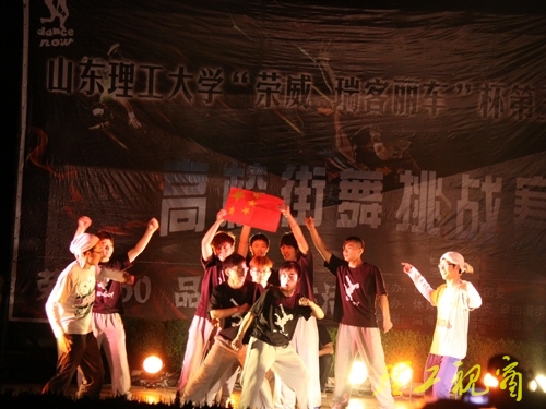 大学生艺术广场上音乐劲爆,活力四射。来自淄博市各高校街舞爱好者以及淄博地区街舞俱乐部的8支舞蹈队参加了比赛。随着主持人热情的开场白,四人组合街舞表演给现场观众们献上了给力十足的开场舞。比赛包括Breaking、Popin、Locking、Jazz、Hip-hop等舞种。现场座无虚席,过道上也站满了人。参赛选手们个性的发型、张扬的服装、跳动的音乐、帅气的动作使整场比赛充满活力。各高校精彩绝伦的演出将比赛一次次推向高潮。翻滚、倒立、弹跳、旋转等高技巧的街舞动作展现出舞者强大的力量、柔韧性和协调性。女生的街舞表演丝毫也不逊色于男生。