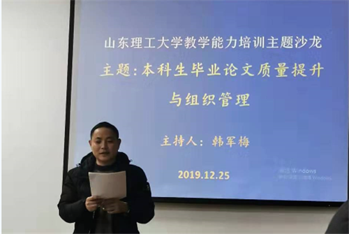 20191225日上午,我院在2号教学楼119讨论教室举办教学能力培训主题沙龙——本科生毕业论文质量提升与组织管理,此次沙龙由教务处主办,我院承办,邀请我院韩军梅主讲。沙龙由我院教学科研工作办公室主任杨刚主持30多位教师参加。