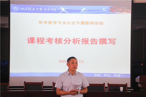 活动伊始,杨刚首先介绍了师范类专业认证的重要意义和目的任务,强调体育教育专业认证是教育部落实党教育方针的重要部署,是进一步规范教学管理,提升人才培养质量的重要举措。提到专业认证工作的任务可分为“三个三”,分别为三个产出、三个支撑、三个评价。并表示认证工作与每一位教师,每一门课程都有直接关系,希望每位教师结合教学大纲修订、课程目标修订,根据专业认证要求,扎扎实实做好课程考核分析报告撰写,学院上下要高度重视,大力宣传。