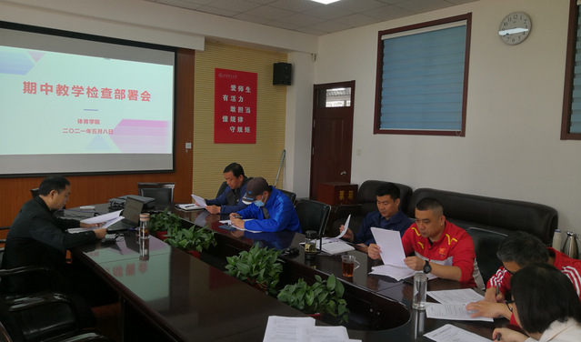 会上,杨刚传达了学校《关于加强考试管理、严肃考风考纪的通知》《关于进一步加强课堂教学管理工作的通知》《关于进行2020-2021学年第二学期期中教学检查的通知》《体育学院2020-2021学年第二学期期中教学检查实施方案》《体育学院关于按照专业认证标准规范课程的要求》《体育教育(师范)专业课程目标达成情况评价实施办法(试行)》等一系列文件,并对相关工作提出具体要求。