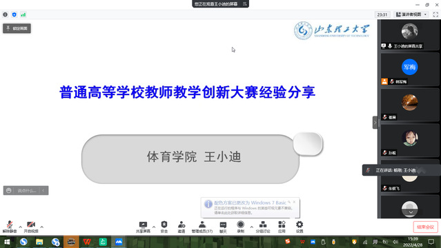 会议伊始,杨刚首先介绍本次会议议程。接着王小迪老师从教师教学创新大赛举办的时代背景、比赛评分标准、申报书和教学创新成果报告的撰写、课堂教学实录以及教学创新设计注意事项等几个方面分享了参加省级教师教学创新大赛的经验。王老师的精彩分享对拟参加教学创新大赛的教师具有很好的借鉴和指导意义。