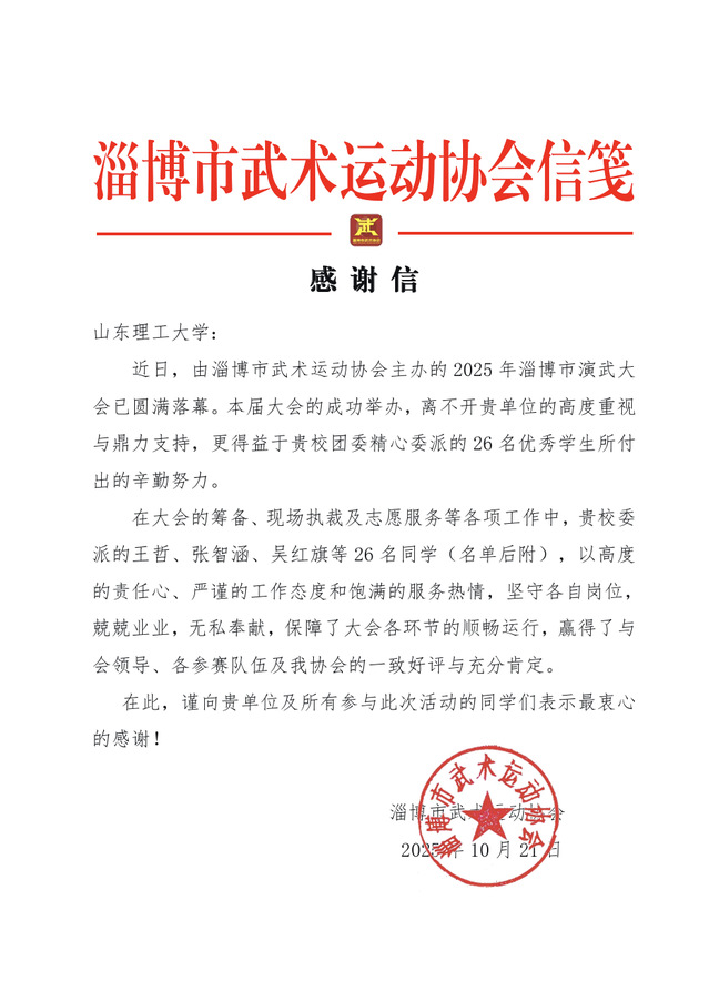 我院更是收到了来自淄博市武术运动协会的表扬信,信中大力称赞了我院学生在2025年淄博市演武大会中的工作中,恪尽职守,秉公执裁,圆满完成了比赛执裁任务,展现了专业裁判的优秀素养。参与执裁的学生表示:“从课堂学习武术理论,到现场参与专业赛事执裁,我们不仅深化了对武术竞赛规则的理解,更学会了如何在高压环境下保持严谨与公正。”胡鹏强调,带领学生参与高水平赛事裁判工作,是我院“以赛促学、以赛促练、以德育人”教学模式的重要实践,既为学生搭建了专业能力展示与提升的平台,也为地方武术运动发展注入了高校力量。