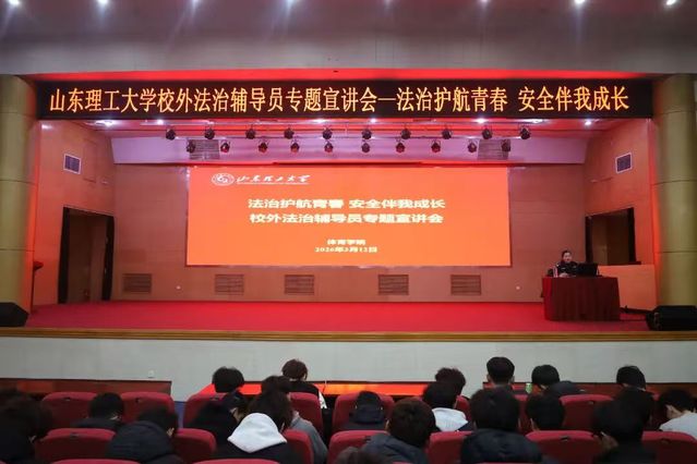 为进一步强化学生法律安全意识,引导同学们学会运用法律武器维护自身合法权益,3月12日下午,山东理工大学体育学院于三号报告厅成功举办《法治护航青春 安全伴我成长》校外法治辅导员专题宣讲会。本次会议由高子鑫老师主持,特邀淄博市公安局张店分局校外法治辅导员赵梓钧警官莅临授课,以精准普法筑牢校园安全屏障。